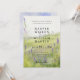 Convite romântico para casamento, com uma paisagem aquática com um campo sereno. Sacudir ao fundo para descobrir as charmosas nuvens de aquarela.