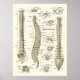 Poster de anatomia espinal mostrando as visões anterior, posterior e lateral da coluna. vértebras marcadas C1, C2, C5, C7, T6, T10 e L3. Seção transversal de uma unidade vertebral e disco intervertebral.