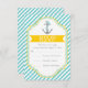 Aqua, listras brancas e cartão de resposta/resposta RSVP de casamento náutico âncora. Um design de padrão na moda com faixas brancas, azuis-aqua, âncora de cinza com um coração azul-turquesa e corda e seu texto em um quadro com faixa amarela. Contemporâneo, mas com um olhar vintage, de certo modo. Você pode alterar o plano de fundo e a cor do texto escolhendo entre mais de 200 cores do gráfico de cores do Zazzle. Este design de classe é um modelo completamente personalizável e faz parte de um casamento perfeito para um casamento de verão.