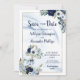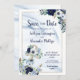 Anuncie sua data de casamento com este elegante cartão SAVE A DATA náutica com uma âncora azul-marinho e branco de ouro floral e fundo de mármore azul. Entre em contato com o designer por meio do Zazzle Chat ou makeitaboutyoustore@gmail.com se você quiser que este design seja modificado, em outro produto ou quiser coordenar ou complementar itens.