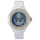 Relógio personalizado de rocha com âncora prateada. Adicione o seu nome a este relógio náutico ou deixe o vazio do campo de nome apenas se precisar do design. Assistentes femininos, elegantes, de rotinas, com tira branca e face náutica.