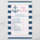 Estes adoráveis "Guess The Price Game Cards" são uma forma excelente de se divertir com o seu Chá de fraldas e é garantido ser um grande sucesso! Simplesmente passe-os durante o Chá de fraldas onde os convidados se divertirão adivinhando quanto cada item de bebê custa. A pessoa com o total mais próximo ganha! Esta adorável design náutica apresenta uma âncora bonita com embelezamento cardíaco.