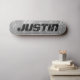 Andar de skate design de placa de aço personalizada. Pavimentos de skate de monograma personalizados com aparência de metal masculino. Design de conselho de madeira legal para rapazes e raparigas. Ideia divertida de presente de aniversário para crianças. Personalize com nome personalizado ou letras iniciais monográficas. Boa ideia de presente para crianças; filho, neto, neta, filha, irmã, irmão, amigos, etc. modelo de tipografia de tendências. Impressão metálico puro.