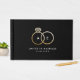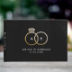 Este livro de hóspedes preto personalizado contém anéis de casamento de folha de ouro falsos e um monograma de casal moderno. Bem-vindos convidados para a sua recepção de casamento com este livro de hóspedes personalizado e você terá um toque para ler muito depois que os sinos de casamento desaparecerem.