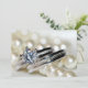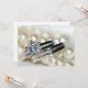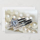 O Convite para Casamento de Anéis e Pérolas Brancas elegantes pode ser personalizado com nomes da noiva e noiva e local e hora específicos da cerimônia de casamento. Este clássico convite nupcial personalizado apresenta uma fotografia aproximada de um colar de pérolas brancas e anel de noivado de diamante redondo e conjunto de bandas de casamento.