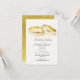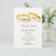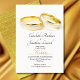 Um convite elegante com alianças de casamento dando ao convite uma sensação muito tradicional. Os anéis estão sobre um simples fundo branco com a tipografia em uma fonte moderna. A fonte está novamente em preto simples. Um bar de cor dourada sublinha a palavra casamento. O inverso do convite é dourado. O convite é facilmente personalizável para suas informações.