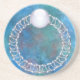 Um anel de filigres prateado estilizado, ornamentado, coberto de pérolas brancas-nubladas e colocado com uma gema branca redonda de solteiro, com uma estrela a brilhar das suas profundidades, colocado contra um pano de fundo de fractais azuis e aquosos.