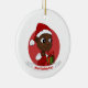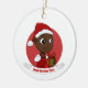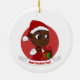 Enfeites de natal com uma ilustração de uma menina ou rapaz preto feliz sorridente e feliz, o bebê está vestindo roupas vermelhas e brancas e segurando um presente; com um modelo de texto editável para seu nome ou mensagem, design de Natal