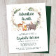 Convite rústico e econômico para chá de bebê de inverno com ilustrações em aquarela de animais da floresta, flores, folhagens e estrelas douradas e flocos de neve. "Aventura Aguarda" e o nome da futura mamãe são escritos em uma fonte verde escura de caçador.
