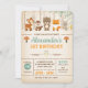 Convite de aniversário da floresta que caracteriza animais adoráveis da floresta - urso, cervos, raposa, chipmunk, coelho e uma coruja