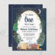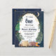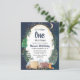 Convite de festa de aniversário de 1 ano rústico e econômico, apresentando uma ilustração fofa de animais da floresta com suas barracas de camping nas montanhas e floresta, uma sobreposição de estrelas e lua douradas em um céu noturno e "Foi um Ano Selvagem!" em escrita e tipografia azul meia-noite escura.