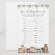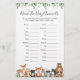 Animais da floresta com o nome do chá de fraldas temido o cartão de caça para bebês animais apresenta uma ilustração de animais da floresta com cor d'água e verde-d'água eucalyptus garland e uma elegante letra de estilo manuscrito.