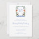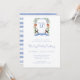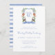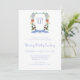 Este adorável convite para ver seria perfeito para apresentar seu doce novo bebê à família e amigos. Ele tem uma crista de aquarela azul monificada cercada por animais verdes e da selva, seu primeiro pacote de alegria inicial e nome, e uma corante aquática azul de coordenação riscada para trás. É único e precioso.