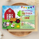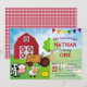 Incêndio aos seus convidados com esta festa de aniversário de fazenda fofa, convidando com um belo celeiro, um trator legal e animais de fazenda adoráveis com tipografia ocular. Basta adicionar os detalhes do seu evento neste modelo fácil de usar para torná-lo um convite de tipo único. Sacudir a placa para revelar um padrão de gingham vermelho e branco na parte traseira da placa.