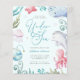Animais Do Oceano Orçamental Sob O Convite De Chá de fraldas Do Sea Boy. Adorados com criaturas lúdicas do oceano como um golfinho, estrelas, polvo e água-viva, ao lado de corais coloridos, todos colocados contra um pano de fundo azul sereno. A caligrafia encantadora expressa lindamente "Sob o Mar", definindo o tom de uma aventura aquática para dar as boas vindas à sua pequena.