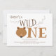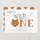 Um primeiro convite de aniversário para bebês. Este convite é castanho e branco, com a palavra "Um" em letras grandes, ilustrando o rosto de urso como primeira letra da palavra. Simplesmente, personalize este convite, adicione-o ao seu carrinho e feliz aniversário ao seu maravilhoso bebê! Design de Feriado de Um Urso Selvagem Primeiro Aniversário Convite de Férias | ©Melissa Patton Artist/Illustrator