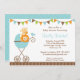 Adorável convite para chás de fraldas, com um leão e girafa sentados em um carrinho de ponto azul com um beliche festivo no topo.