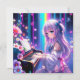 Menina de anime bonito tocando piano cercada por estrelas e flores em roxo, azul e rosa.