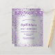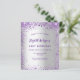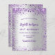 Um convite de aniversário feminino e feminino de 21 ruas (ou qualquer idade). Na frente: Uma moda de moda falsa com um fundo de prata. Decorado com brilho violeta e roxo escuro, brilhos. Personalize e adicione um nome, detalhes da parte. O nome é escrito com um script de estilo manuscrito, letras cor roxa. Traseira: fundo prateado sujo e falso brilho. 1 folha = 1 convite