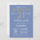 Convite para aniversário de 21 anos surpresa com fundo de brilho azul e Dourado. Aniversário Adulto. Homens ou Mulheres no Dia Convidam. Qualquer idade.