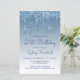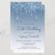 Este convite de festas aniversário de 21 anos glamouroso apresenta uma borda brilhante azul cintilante e fundo azul ombre. O aniversário editável e o nome do convidado de honra aparecem em um script de escrita manual azul casual, com o resto do texto personalizável em fonte azul sans serif. O mesmo design de gota a gota azul aparece no verso.