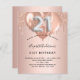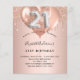Para um aniversário de 21 anos elegante. Um fundo de aparência metálica falsa rosa dourado. Decorado com rosa dourado, pingos cor-de-rosa, pintura com aspecto pingado e balões. Personalize e adicione um nome e detalhes da festa. O nome é escrito com um script de estilo manuscrito, número 21 com fontes no estilo balão prateado.