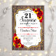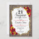 Convite para aniversário de 21 anos surpresa. Design branco, branco, vermelho e rústico feminino com ouro brilhante. Apresenta padrão de madeira, rosas vermelhas, girassóis, fontes de script e confetti. Perfeito para uma bolsa mensageifesta de aniversario elegante. Pode ser personalizado para mostrar qualquer idade. Envie-me uma mensagem se precisar de mais personalização.