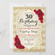 Convite para aniversário de 30 anos. Design elegante em ouro e vermelho. Apresenta faixas de ouro com brilho sutil, fonte de script do rosa vermelha na moda e confetti. Perfeito para uma festa de aniversário de vidro.