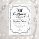 Convite para aniversário de 30 anos elegante. Na moda design em branco e prata. Possui cor damasco, fonte de script e falso confetti prateado brilhante. Perfeito para uma festa de aniversário branca. Pode ser personalizado para mostrar qualquer idade. Envie-me uma mensagem se precisar de mais personalização.
