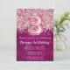 convite de festas de aniversário de 3 anos para um escrevendo de aniversário de 3 anos Girly Magenta e Rosa Glitter para uma menina de 3 anos com roteiro moderno e balões de folha divertida.