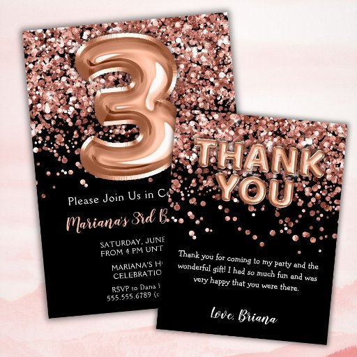 aniversário de 3 anos Invitation Black Rosa Dourado Glitter Elegante negro e rosa aniversário de 3 anos gold convite de festas para uma garota de 3 anos com roteiro moderno e balões de folhas divertidas.