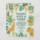 Celebre o terceiro aniversário de sua pequena coisa selvagem com este convite temático "Jovem, Selvagem e Três", com folhas falsas de ouro (girafa, leão e macacos), folhagem de ouro e selva verde, e borrão de ouro. Adicione o nome do seu filho e os detalhes da festa em texto preto num fundo verde pastel. Um padrão de folhagem da selva em verde e ouro decora a parte de trás da carta.
