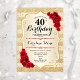 Convite para aniversário de 40 anos. Design elegante em ouro e vermelho. Apresenta faixas de ouro com brilho sutil, fonte de script do rosa vermelha na moda e confetti. Perfeito para uma festa de aniversário de vidro.
