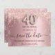 Uma moeda e uma tendência Salve a placa de Data para um aniversário de 40 anos. Fundo cor-de-rosa embebido decorado com ouro rosa e brilho prateado falso e poeira. Personalize e adicione uma data e um nome/texto. O texto: Salvar a Data é gravado com um script de estilo com letra de tendência grande com alternâncias. Número 40 com uma fonte no estilo do balão.