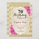 Convite de aniversário de 70. Design elegante em ouro e rosa. Apresenta faixas de ouro com brilho sujo, fontes de script de na moda de rosas cor-de-rosa e confetti. Perfeito para uma festa de aniversário de vidro.