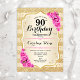 Convite de aniversário de 90. Design elegante em ouro e rosa. Apresenta faixas de ouro com brilho sujo, fontes de script de na moda de rosas cor-de-rosa e confetti. Perfeito para uma festa de aniversário de vidro.