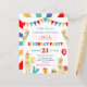 Um lama e um Convite de aniversário infantil. Num fundo branco, ao lado de um beliche multicolorido, balões, bolo e presente, lhamas são vistas vestidas de roupa de festa e comemorando. O texto da tipografia lê pequenos lhamas, por favor juntem-se a nós para o nome do seu filho como festa de aniversário. A idade da criança é mostrada em balões multicoloridos. Personalize adicionando seu evento de cheio e os detalhes de contato.