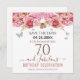 Rapariga reluzente, fundo cor-de-rosa milenar, com tipografia de nome de script de rico. Feliz 70 anos e fabuloso design de aniversário. Rosas rosa e borboletas na borda superior. Excelente para comemorações de 70. Salve o lembrete de celebração de data.
