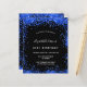 Um convite de aniversário feminino e feminino de 21 ruas (ou qualquer idade). Na frente: Um fundo preto chic. Decorado com poeira azul-real de brilho. Personalize e adicione um nome e detalhes da parte. O nome é escrito com um script de estilo manuscrito.