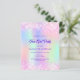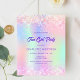 Um convite de aniversário feminino e feminino para uma menina adolescente. Na frente: Um arco-íris, fundo holográfico colorido em roxo, rosa, verde-menta. Decorado com faíscas rosadas. Personalize e adicione um nome e detalhes da parte. O nome é escrito com um script de estilo manuscrito, letras cor roxa. 1 folha = 1 convite impresso de borda a borda.