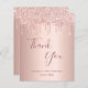 Um cartões de agradecimentos para um aniversário de 50 anos (ou qualquer idade). Uma cor metálica de fundo rosa dourada falsa. Com pingos de brilho sujo, pintura com pingos. Na frente, um grande e escuro, rosa dourado, escrita à mão, colorida, e o texto: Obrigado, seu texto, título e uma data. Voltar: Personalize e adicione seu nome e nota de agradecimento.