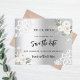 Um moderno e elegante Salve a Data para uma 50ª festa de aniversário. Um fundo com aspecto fino prateado, decorado com flores brancas e rendas brancas. Personalize e adicione uma data e um nome. O texto: Salvar a Data é gravado com um script de estilo com letra de tendência grande. 1 folha = 1 convite impresso de borda a borda.