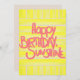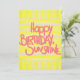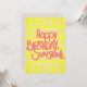 Cartão de saudação de aniversário com um sol listrado amarelo neon brilhante abstrato e um grande texto escrito à mão "Feliz Aniversário, Sol" a rosa brilhante.