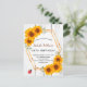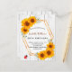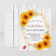 Para uma festa de aniversário de 50ª (ou qualquer idade). Um fundo de madeira branco rústico, decorado com girassóis. Um falso quadro geométrico dourado e uma bela joaninha vermelha. Personalize e adicione o nome, a idade e os detalhes da festa na frente. Traseira: madeira branca, design postal. Dica: Se você não quiser que pareça um cartão postal, clique em personalizar, vá para o verso e remova o divisor e o carimbo de posto.