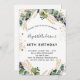 Para uma festa de aniversário de 40ª (ou qualquer idade). Um fundo branco decorado com verde de eucalipto e folhas de ouro. Decorado com pontos de brilho de ouro falsos. Personalize e adicione seus nomes e detalhes do casamento. Letras pretas e ouros coloridas. Fundo branco.