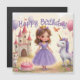 Uma pequena princesa celebra seu dia especial com um unicórnio, um bolo rosa, e balões alegres em um sonhador campo de conto de fadas, onde a magia brilha em cada esquina e a felicidade enche o ar como poeira estelar