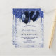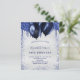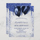 Um convite de aniversário feminino e feminino do 18º (ou qualquer idade). Na frente: um fundo falso prateado. Decorado com gotas de brilho azul marinho, aspecto de pingar tinta e balões. Personalize e adicione um nome e detalhes da parte. O nome é escrito com um script de estilo manuscrito.