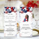 Cartão de menu de festa de aniversário. Decorado com balões patrióticos coloridos em azul vermelho e branco, azul e vermelho brilha. Personalize e adicione um nome, idade, data e menu. Adicione uma foto da aniversariante, fatos e nomes divertidos.