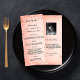 Cartão de menu de festa de aniversário. Personalize e adicione um nome, idade, data e menu. Um fundo de gradiente laranja, decorado com falso brilho, brilhos. Letras coloridas com ouro. Adicione uma foto da aniversariante, fatos e nomes divertidos.