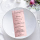 Cartão de menu de festa de aniversário. Personalize e adicione um nome, idade, data e menu. Fundo metálico de aparência falsa, cor-de-rosa esfarelado, decorado com pingos de brilho sujo. Letras pretas coloridas. Adicione uma foto da aniversariante, fatos e nomes divertidos.